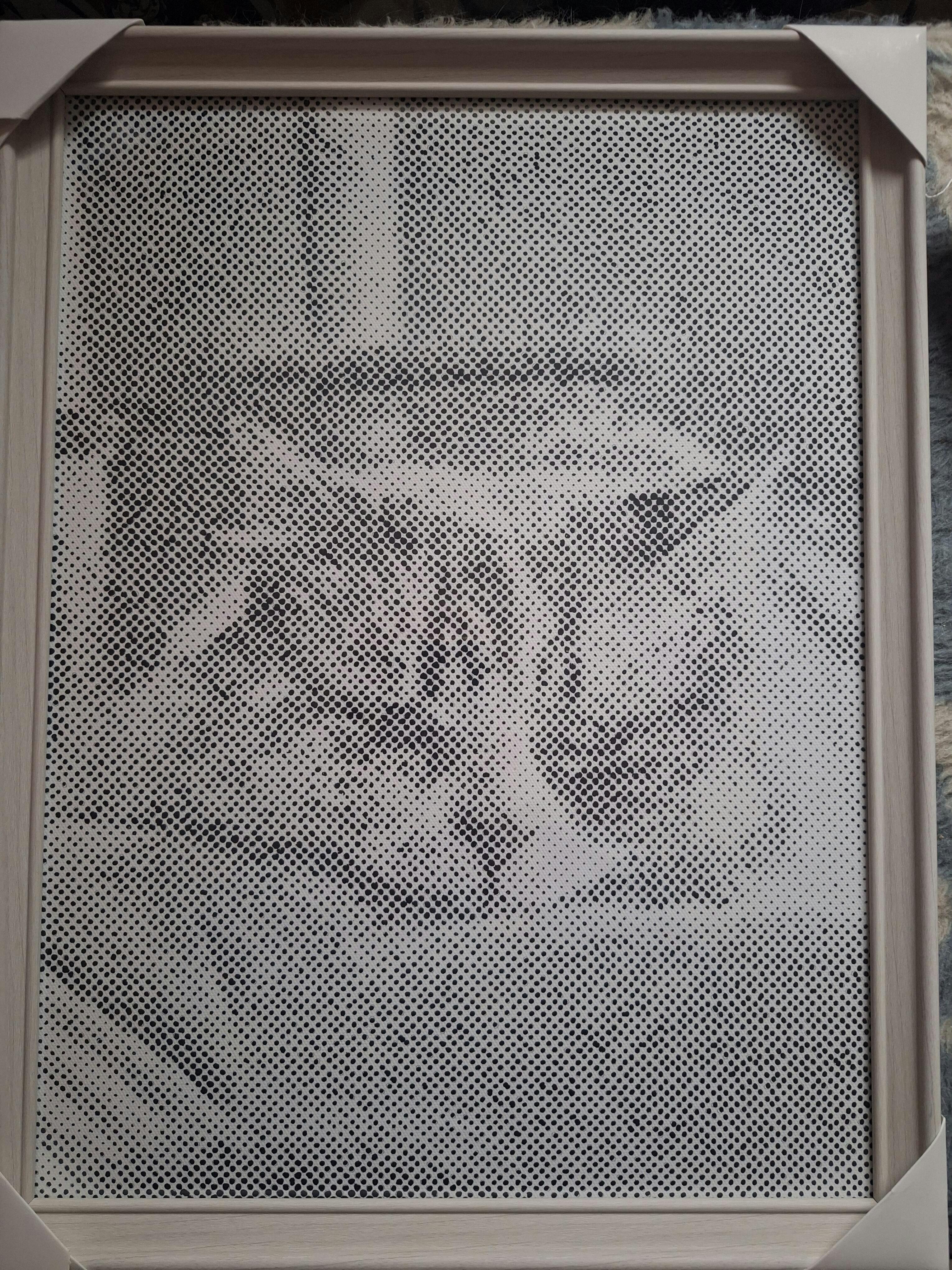 De stipjes variëren in grootte, waardoor er diepte en textuur in het schilderij ontstaat, op deze manier kan je dus perfect je foto natekenen met een extra touch.